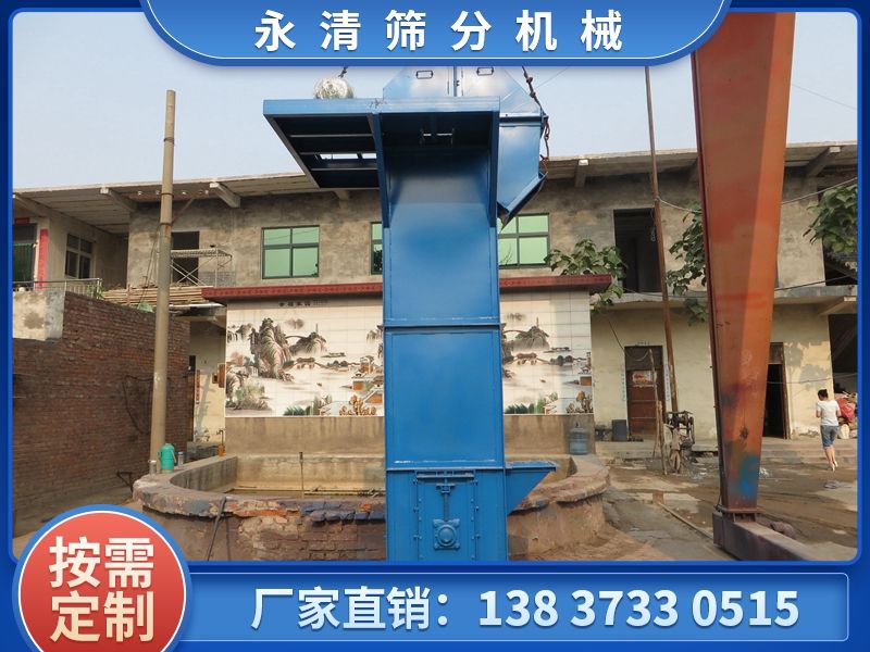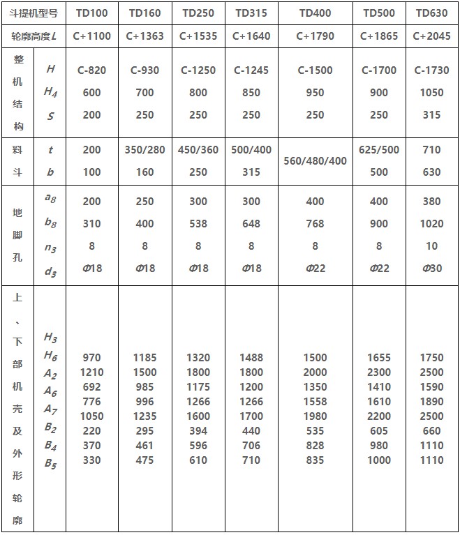 TD型垂直斗式提升機由運行部分(料斗與牽引膠帶)、帶有傳動滾筒的上部區段、帶有拉緊滾筒的下部區段、中間機殼、驅動裝置、逆止制動裝置等組成,適用于向上輸送松散密度ρ<1.5t/m3粉狀、粒狀和小塊狀的無磨琢性和半磨琢性散狀物料,如煤、砂、焦末、水泥、碎礦石等。本機的特點為快速離心卸料:并采用橡膠輸送帶為牽引構件,故不適于輸送大塊磨琢性及掏取阻力大的物料。被輸送物料的溫度不得超過60℃,如采用耐熱橡膠帶時溫度不超過200℃。與D型斗式提升機相比,具有輸送效率高,料斗型式多等特點。