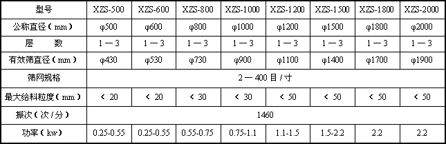 XZS系列旋振篩振動形式特殊,物料運動軌跡和振幅可調,滿足不同工藝要求。任何顆粒、細粉、漿液均可篩分過濾;篩分效率高,既可概略分級,又可進行精細篩分或過濾;體積小、重量輕、安裝移動方便;網架設計獨特、換網容易,篩網壽命長、清洗方便、操作簡單;全封閉,無粉塵溢散,有利于改善勞動條件;粗、細料自動分級排出,能實現自動化作業;出料口繞軸線360°任意設置,便于布置配套設備;耗能小,噪音低、滿足節能、環保要求;保養簡單,可單層或多層使用。